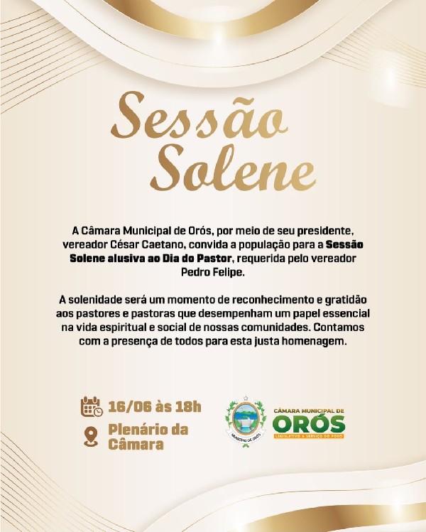 A Câmara Municipal de Orós, por meio de seu presidente vereador César Caetano, realiza no próxima segunda, 16 de junho, às 18h, Sessão Solene alusiva ao Dia do Pastor, requerida pelo vereador Pedro Felipe.