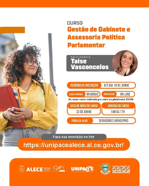 Servidores municipais, ainda dá tempo de garantir sua vaga no curso Gestão de Gabinete e Assessoria Política Parlamentar, promovido pela UNIPACE em parceria com a Câmara Municipal de Orós!