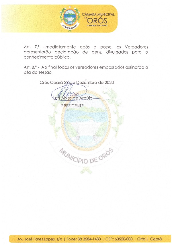 PARA A SESSÃO DE POSSE DOS VEREADORES DA CÂMARA MUNICIPAL DE ORÓS-CEARÁ PARA A LEGISLATURA 2021/2024.