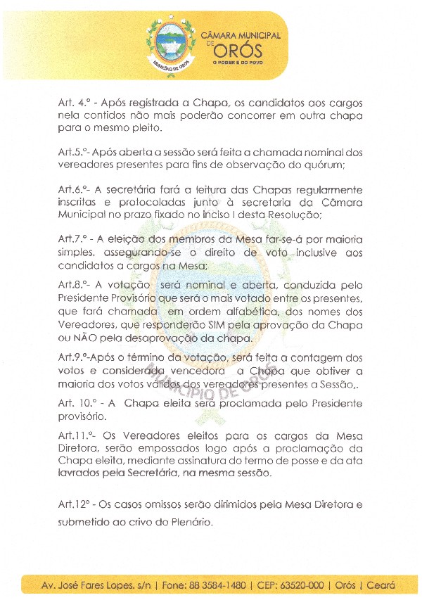 Art.6.º- A secretária fará a leitura das Chapas regularmente inscritas e protocoladas junto à secretaria da Câmara Municipal no prazo fixado no inciso I desta Resolução;