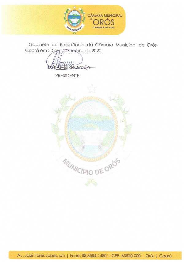 Gabinete da Presidência da Câmara Municipal de Orós-Ceará em 30 de Dezembro de 2020.