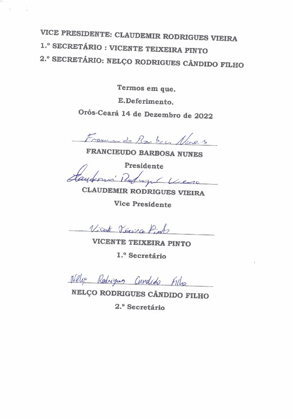firmado pelos Srs. : FRANCIEUDO BARBOSA NUNES CANDIDATO A PRESIDENTE; CLAUDEMIR RODRIGUES VIEIRA CANDIDATO A VICE PRESIDENTE; VICENTE TEIXEIRA PINTO CANDIDATO A PRIMEIRO SECRETÁRIO
