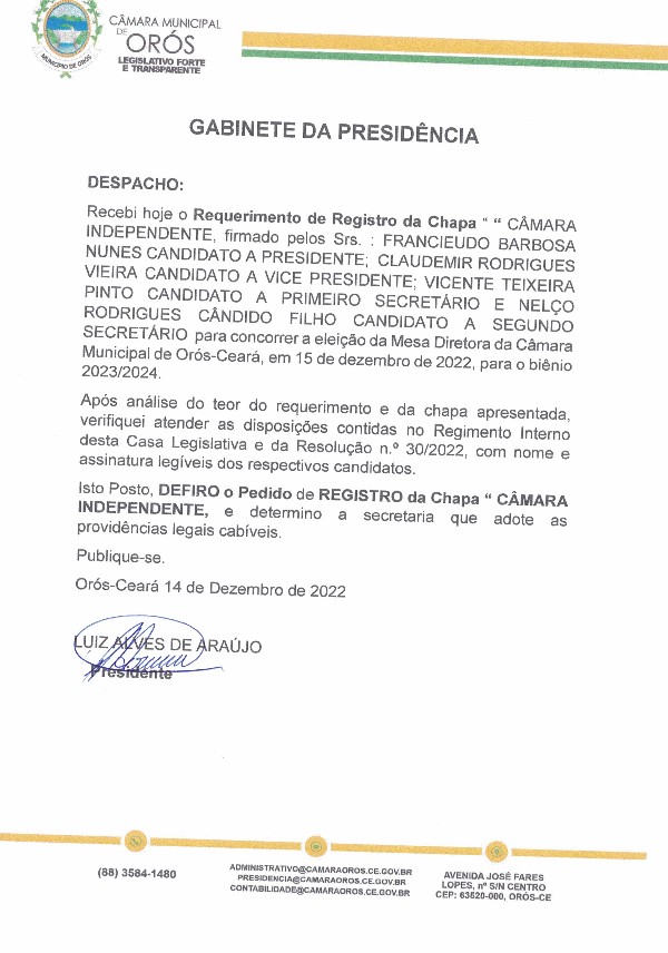 Requerimento de Registro da Chapa Câmara Independente