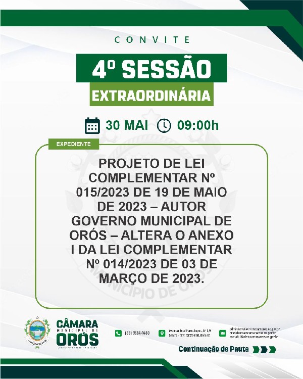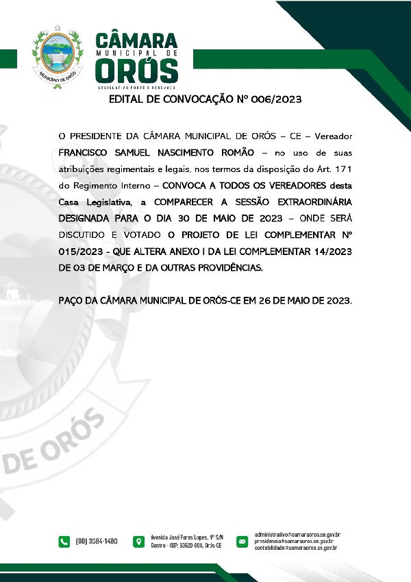 O PRESIDENTE DA CÂMARA MUNICIPAL DE ORÓS - CE - Vereador FRANCISCO SAMUEL NASCIMENTO ROMÃO - no uso de suas atribuições regimentais e legais, nos termos da disposição do Art. 171 do Regimento Interno - CONVOCA A TODOS OS VEREADORES desta Casa Legislativa, a COMPARECER A SESSÃO EXTRAORDINÁRIA DESIGNADA PARA O DIA 30 DE MAIO DE 2023 - ONDE SERÁ DISCUTIDO E VOTADO O PROJETO DE LEI COMPLEMENTAR Nº 015/2023 - QUE ALTERA ANEXO I DA LEI COMPLEMENTAR 14/2023 DE 03 DE MARÇO E DA OUTRAS PROVIDÊNCIAS.