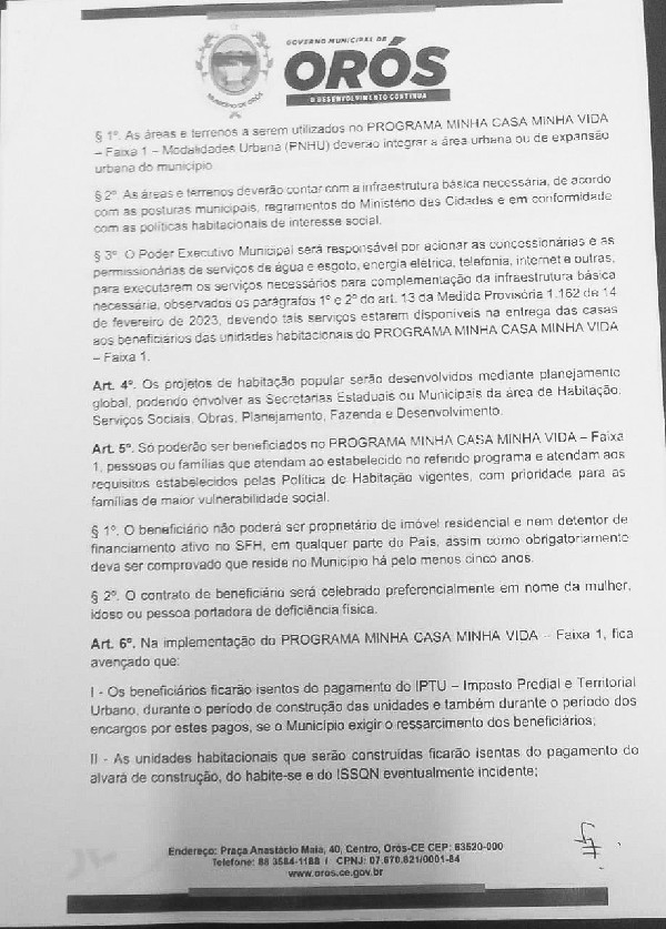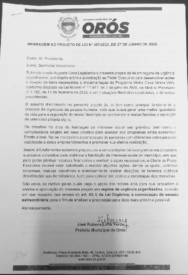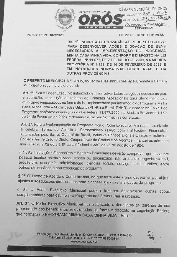O presidente da Câmara Municipal de Orós-CE, devidamente assinado, no exercício de suas atribuições legais e regimentais, com base no art. 171 do Regimento Interno, convoca todos os vereadores desta Casa Legislativa a comparecerem à votação extraordinária designada para o dia 05 de julho de 2023. Nessa sessão, será discutido e votado o Projeto de Lei nº 307/2023, que trata da autorização ao Poder Executivo para desenvolver ações e realizar doações de bens necessárias à implementação do programa Minha Casa, Minha Vida, conforme disposto na Lei Federal nº 11.977 de 07.07.2009, na Medida Provisória nº 1.162 de 14.02.2023 e em instruções normativas correlatas.