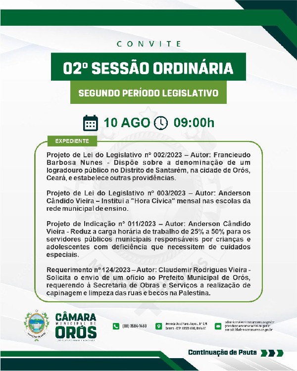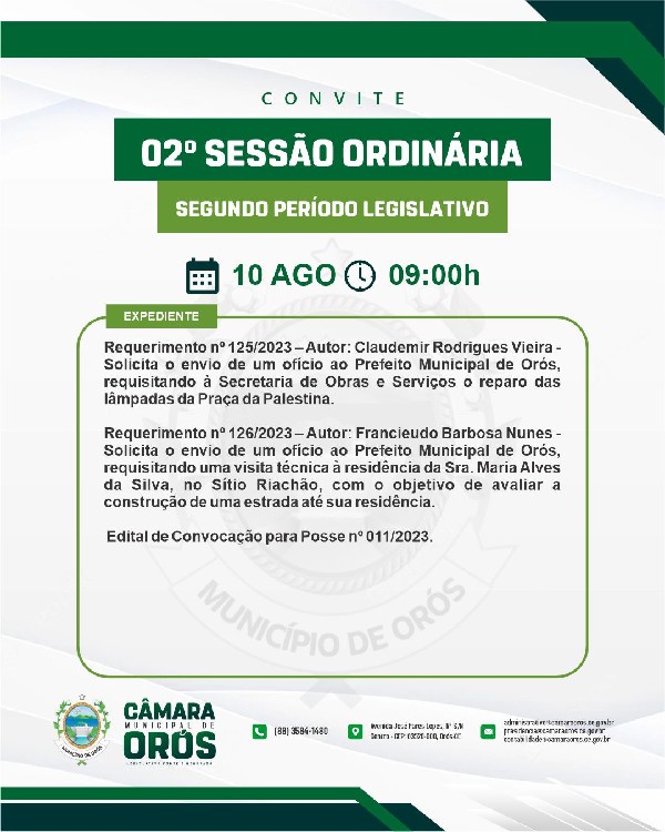 Quinta-feira (10), às 09:00h, será realizada a 02ª Sessão Ordinária, do segundo período legislativo de 2023.