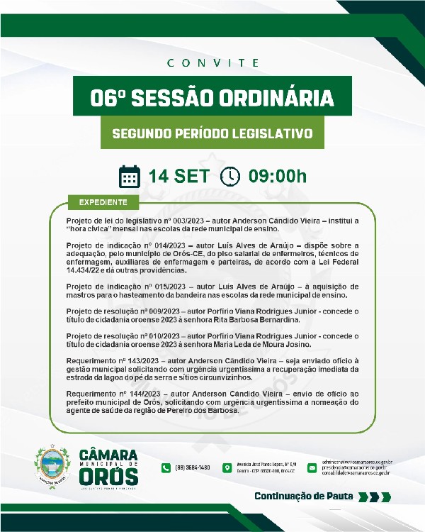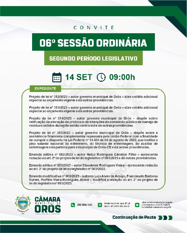 Quinta-feira (14), às 09:00h, será realizada a 06ª Sessão Ordinária, do segundo período legislativo de 2023.