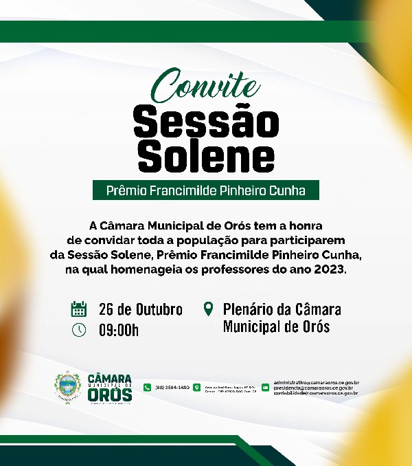 A Câmara Municipal de Orós tem a honra de convidar toda a população para participarem da Sessão Solene, Prêmio Francimilde Pinheiro Cunha, na qual homenageia os professores do ano 2023.