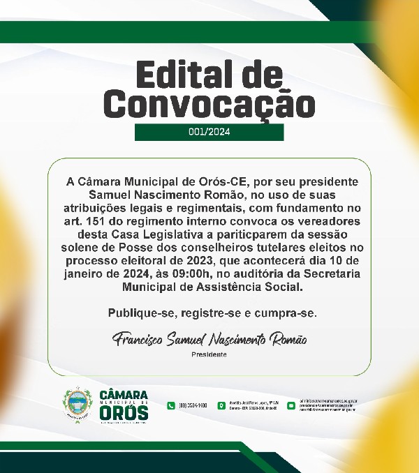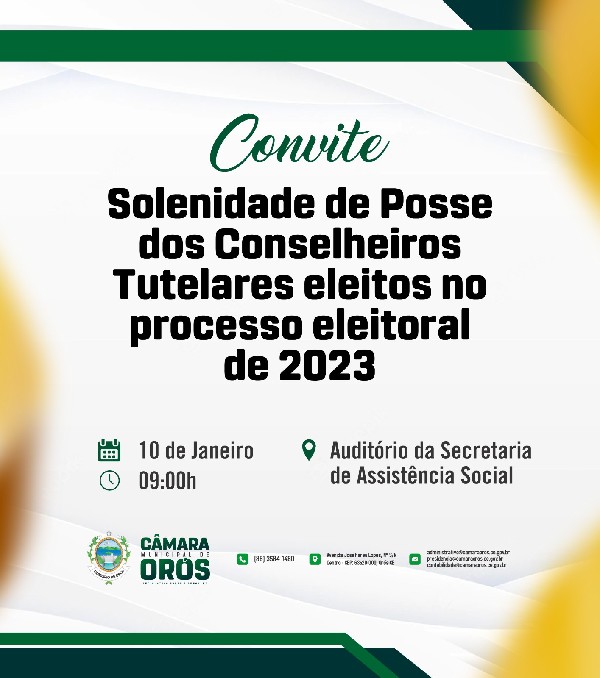 Convite especial da Câmara Municipal de Orós! Junte-se a nós na sessão solene de posse dos conselheiros tutelares eleitos no processo eleitoral de 2023. Sua presença faz toda a diferença para nossa comunidade.