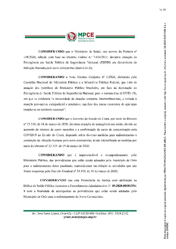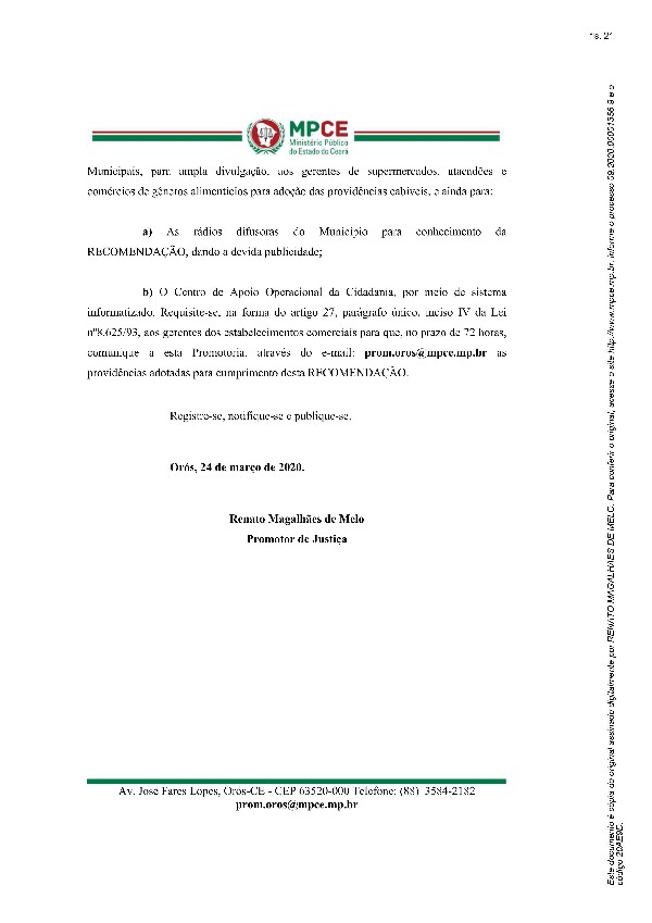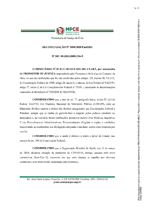O Promotor de Justiça Renato Magalhães Neto, que responde pela comarca de Orós emitiu 02(duas) recomendações em meio a Pandemia de COVID-19.