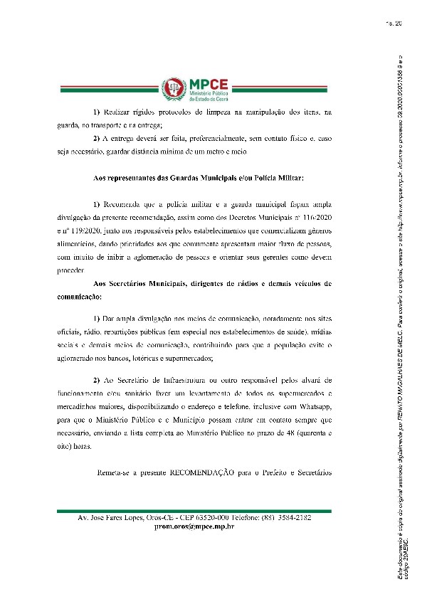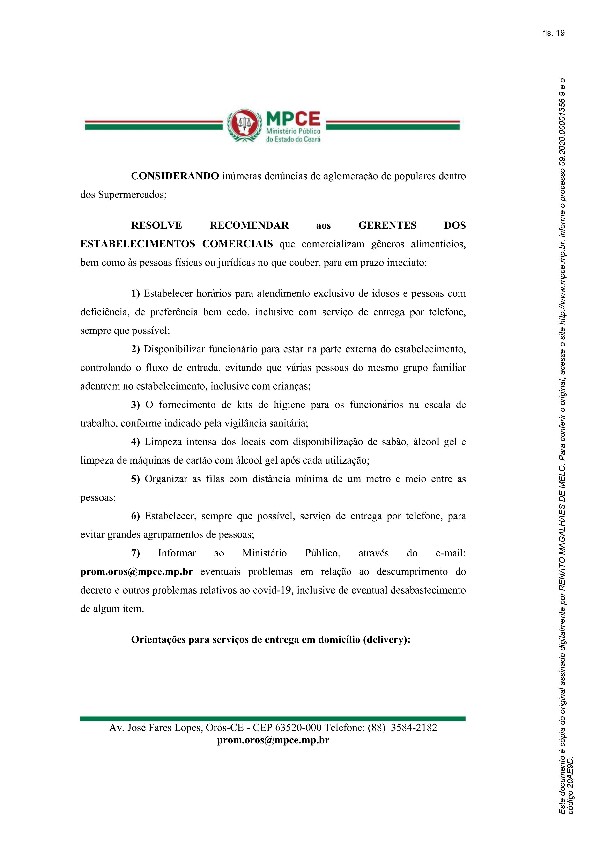 A recomendação 0004/2020/PmJORS trata de recomendação aos gerentes de estabelecimentos comerciais do município de Orós para que em prazo imediato: estabeleçam horários para atendimento exclusivo de idosos e pessoas com deficiência(inclusive com serviço de entrega a domicílio, se possível); disponibilização de funcionário na parte externa controlando fluxo de entrada; fornecimento de kits de higiene para funcionários; limpeza intensa dos locais com disponibilização de sabão, álcool gel, e limpeza de máquinas de cartão com álcool gel depois de cada utilização; organização de filas com distância mínima de um metro e meio entre as pessoas; estabelecer, sempre que possível, entrega opor telefone para evitar aglomeração de pessoas; e informar ao Ministério Público através do email: prom.oros@mpce.mp.br eventuais problemas em relação ao descumprimento do decreto e outros problemas relativos ao COVID-19, inclusive de eventual desabastecimento de algum item. O documento também trás orientações relacionadas a entrega à domicílio(delivery), entre outras recomendações.